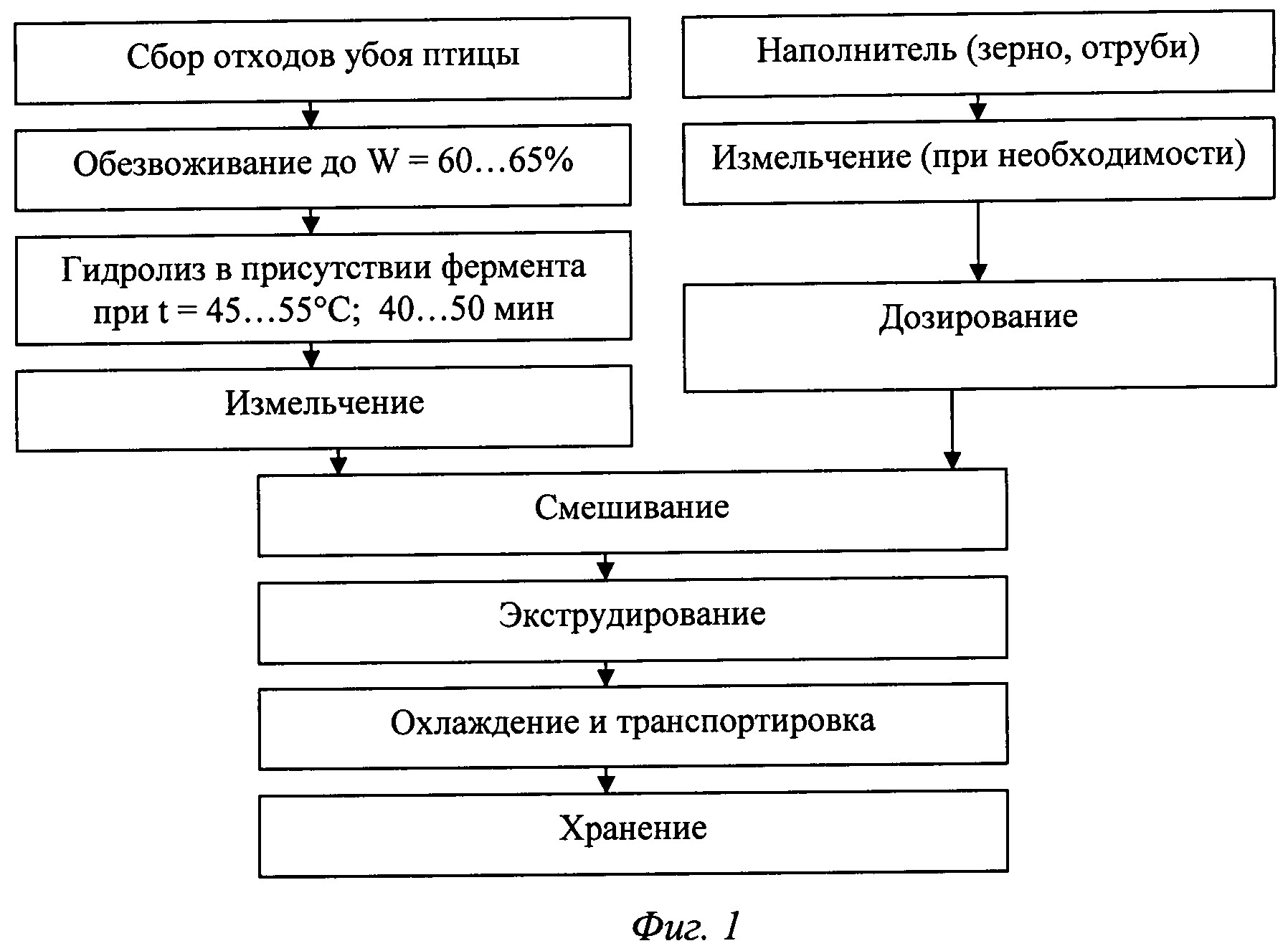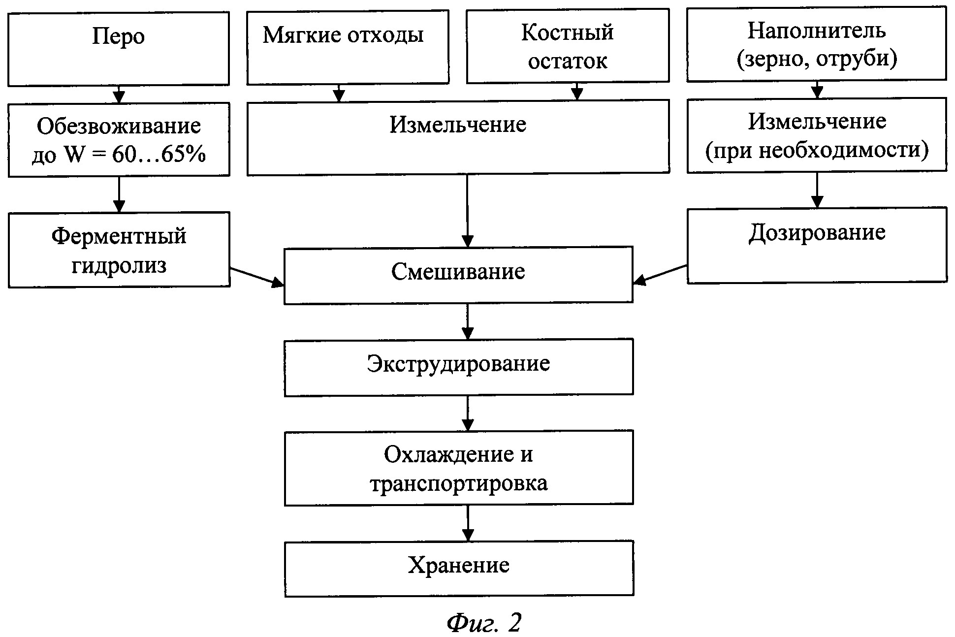 ущность изобретения заключается в том, что отходы убоя комплексно, без разделения, подают в цех переработки, предварительно обезвоживают до оптимальной влажности 60 65%, затем загружают в гидролизер, где к ним добавляют ферменты и проводят низкотемпературный гидролиз при температуре 45 55°C в течение 40 50 мин. Затем отходы измельчают и подают в смеситель, где их смешивают с наполнителем (например, с отрубями) в соотношении примерно 1:3 и экструдируют, далее охлаждают и транспортируют на склад для хранения или на реализацию. При применении пневмотранспорта отходы охлаждают в процессе транспортирования холодным воздухом. Сбор отходов без разделения упрощает линию сбора отходов, уменьшает номенклатуру и количество технологического оборудования. Предварительное обезвоживание уменьшает влажность отходов и потребное количество наполнителя, что повышает белковую ценность конечного продукта. Проведение низкотемпературного ферментного гидролиза позволяет снизить затраты энергии на гидролиз пера (по сравнению с паровым) и перевести кератины пера в легкоусвояемую форму, что также повышает усвояемость готового корма. При дальнейшем экструдировании смеси отходов с наполнителем происходит ее нагревание до температуры 120 150°C при давлении до 4 МПа, за счет чего смесь стерилизуется и обеззараживается, гомогенизируется (становится более однородной за счет взаимного проникновения компонентов), стабилизируется и обезвоживается при дальнейшем охлаждении. Охлаждение в процессе транспортирования упрощает линию переработки, исключая охладитель. При этом происходит снижение влажности до 9 11% и корм может храниться до 6 месяцев. Все это приводит к упрощению комплексной переработки отходов, снижению энергозатрат и повышению качества конечного продукта. Данный способ применим и при раздельном сборе отходов. В этом случае низкотемпературному ферментному гидролизу подвергают только перо и другие кератинсодержащие отходы (лапы, головы), а затем гидролизат смешивают с другими отходами и наполнителем и далее также подвергают экструдированию. На фиг.1 показана блок-схема предлагаемого процесса утилизации отходов без разделения, а на фиг.2 - схема утилизации отходов при раздельном сборе. При сборе отходов без разделения способ осуществляется следующим образом (фиг.1). Отходы убоя птицы в цехе убоя собирают на общий конвейер и подают без разделения в цех утилизации. Далее они поступают на сепаратор, где их влажность доводят до 60 65%, и подают в гидролизер. Одновременно в гидролизер подают фермент из расчета 0,5 1 кг на 1 т и кофермент в количестве 5 кг/т. Далее массу нагревают до t=45 55°C и выдерживают при этой температуре не менее 40 50 мин. При этом перо распадается, его кератины переходят в легкоусвояемую форму. После завершения гидролиза отходы измельчают и подают в смеситель, где смешивают с предварительно измельченным наполнителем, в качестве которого может быть использовано зерно или отходы его переработки, например, отруби. Количество наполнителя должно быть таким, чтобы влажность смеси не превышала 30% (примерное соотношение отходов к наполнителю 1:3). Далее смесь отходов подают в экструдер. При прохождении смеси через компрессионные диафрагмы экструдера за счет трения повышается температура и развивается давление свыше 4 МПа. Время прохождения 
