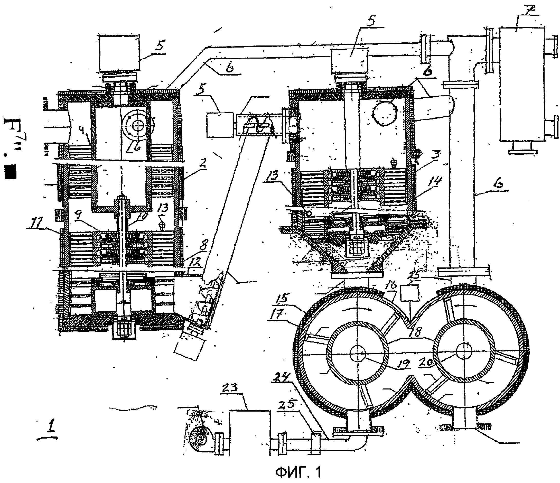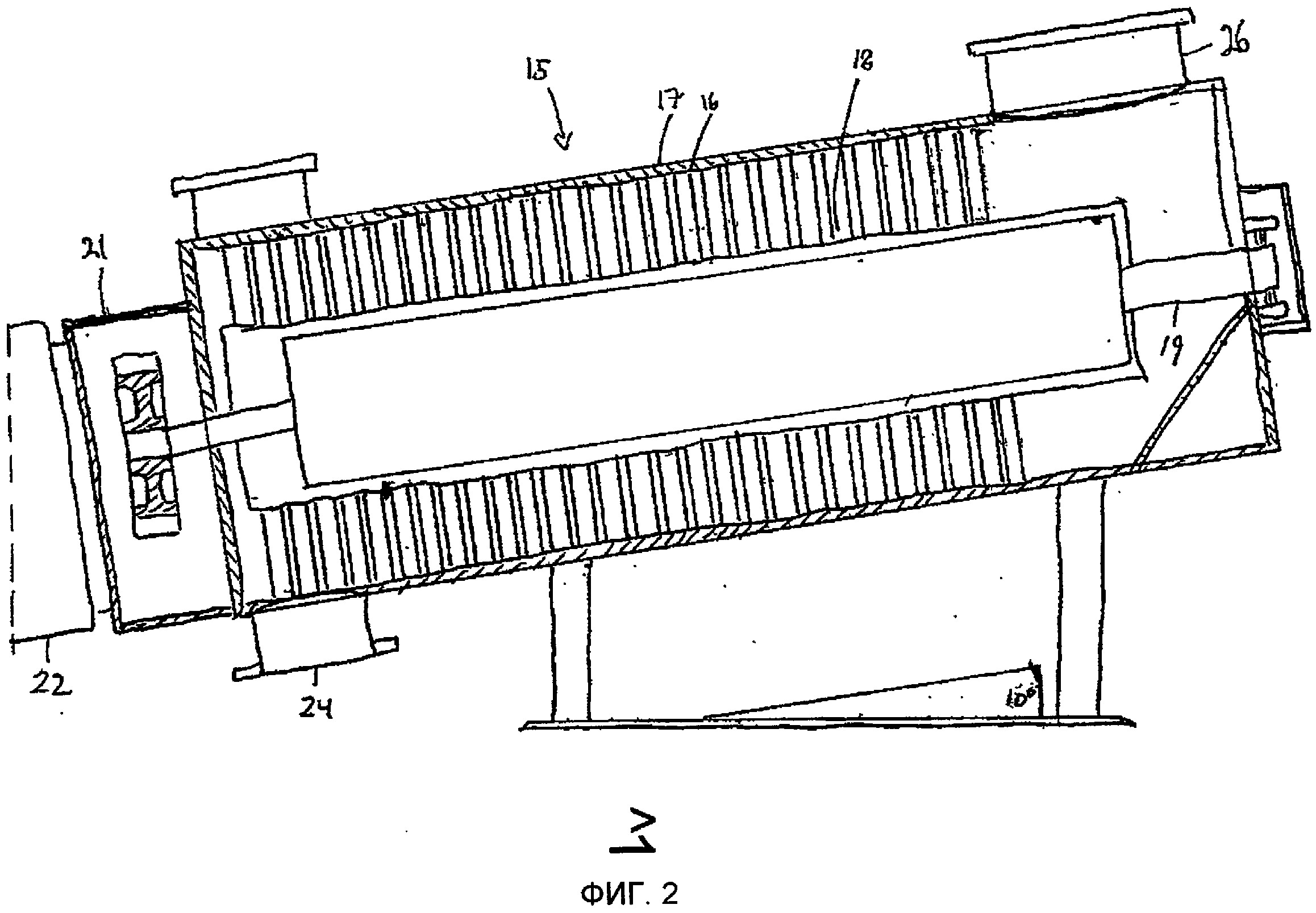 Способ согласно изобретению, как схематически показано на фиг.1, включает несколько стадий способа, где первая стадия включает подачу биологической массы в форме осадка из очистных сооружений и возможно других органических отходов производства, например, в емкость для смешивания 1. Емкость для смешивания 1 может содержать, например, цилиндрическую толстостенную стальную емкость, обеспечиваемую внешним электрическим нагревательным контуром, индукционной катушкой, нагревательным контуром 2 на основе воды/газа или т.п. Предпочтительно емкость для смешивания 1 содержит внешнюю теплоизоляционную рубашку 3. Внутри емкости для смешивания 1 располагаются несколько роторов 4, каждый из которых содержит несколько динамических лопастей на различных уровнях по вертикали. Роторы 4 могут приводиться в движение электрическим или гидравлическим двигателем 5, например, возможно в комбинации с клиновидным ремнем или т.п. Цель емкости для смешивания 1 состоит в размешивании биомассы до состояния гомогенной смеси, разбивании более крупных частиц на мелкие, диспергировании частиц и в нагревании биомассы при использовании комбинации фрикционной обработки и подводимого тепла до примерно, например, 55°С. Из емкости для смешивания 1 отработанный газ выводят через выводной газовый штуцер 6 в конденсатор 7, конденсат из которого будет превосходным образом пригоден для использования в качестве удобрения. Из емкости для смешивания 1 предварительно обработанная биомасса будет под действием силы тяжести падать непосредственно в реакционную емкость 8 для обработки серной кислотой. Указанная обработка серной кислотой образует этап 2 способа. Реакционная емкость 8, как и емкость для смешивания 1, включает цилиндрическую толстостенную стальную емкость, и в настоящем варианте осуществления, приведенном в качестве примера, соединена фланцевым типом соединения с емкостью для смешивания 1. Как и емкость для смешивания 1 реакционная емкость 8 включает внешнюю теплоизоляционную рубашку 3, но в отличие от емкости для смешивания 1 реакционная емкость 8 не включает контур обогрева 2. Реакционная емкость 8 также включает роторы 9 с тем, что роторы 9 реакционной емкости 8 разделяют или присоединены к оси ротора 10 роторов 4 емкости для смешивания 1. Роторы 9 расположены таким образом, чтобы оказывать (динамическое) воздействие поочередно в противоположных направлениях. Этого можно достичь, если ось ротора 10 обеспечивают множеством колец 11 с лопастями, каждое из колец с лопастями обеспечивается несколькими динамическими лопастями, как, например, 4 в каждом кольце с лопастями. Первое кольцо с лопастями может монтироваться на оси ротора 10 шлицевым соединением с другим кольцом с лопастями, вращающимся в противоположном вращательном направлении при помощи шлицевого соединения и планетарной передачи, состоящей из центральной шестерни, шестерни планетарной передачи, гнезда шестерни планетарной передачи и внутренней зубчатой венцовой шестерни, а также обгонной муфты, работающей по принципу заклинивания брусков, между осью ротора 10 и гнездом шестерни планетарной передачи. Все последующие кольца с лопастями имеют то же направление вращения, что и первое кольцо с лопастями или также (предпочтительно) каждое второе кольцо с лопастями может вращаться в противополож