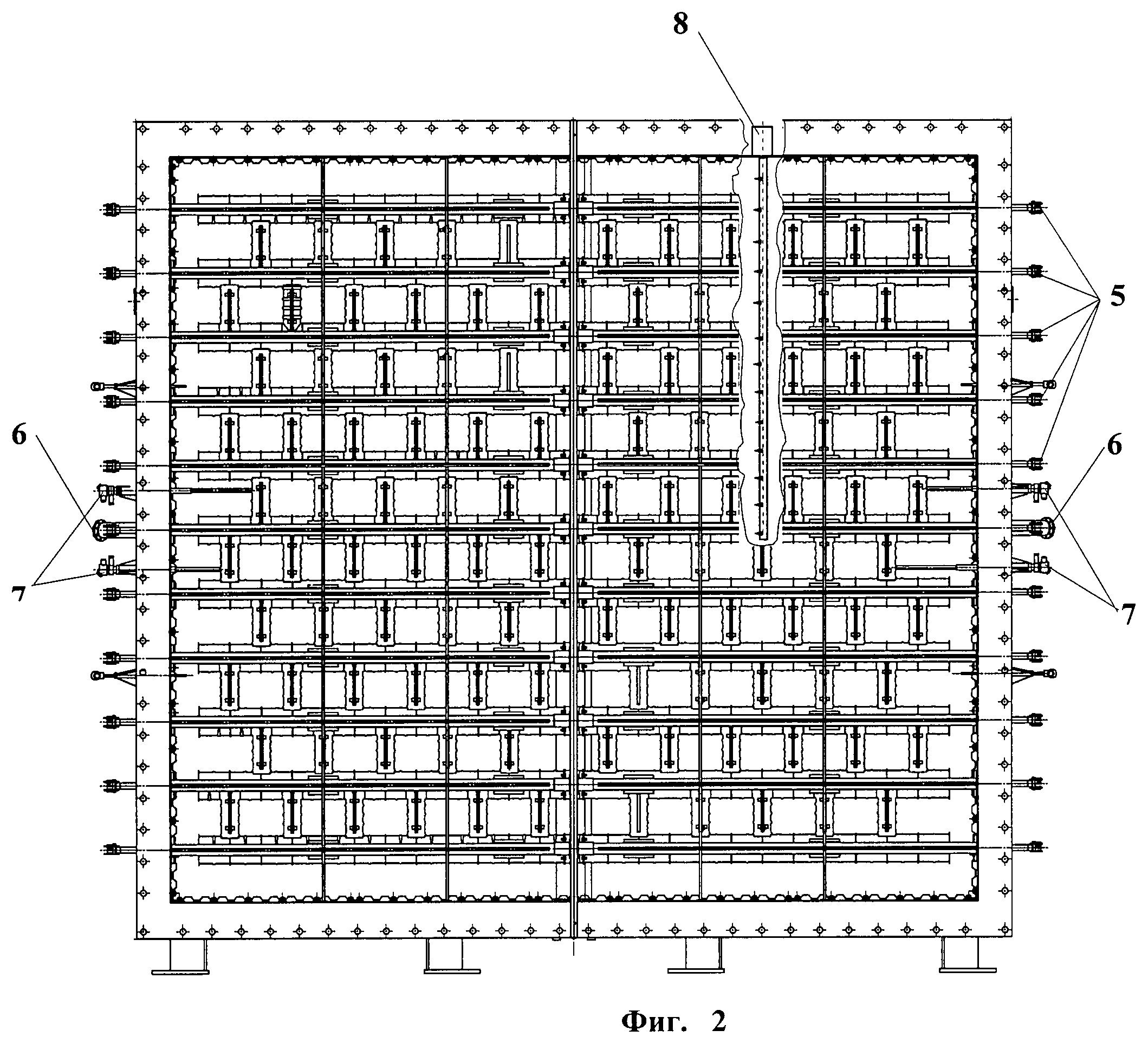 Камера дожигания работает следующим образом. После запуска и выведения газотурбинного двигателя на заданный режим разжигаются воспламенители 6 и подается топливный газ в коллектор центрального фронтового устройства 1. Горение топлива в дежурной зоне контролируется термопарами 7 и термогребенкой 8. При устойчивом горении топливо подается в коллекторы фронтовых устройств 2, расположенных выше и ниже от центрального, и далее последовательно разжигаются фронтовые устройства, примыкающие к зоне горения. Воспламенение топлива во фронтовых устройствах 2 происходит от горящих соседних устройств, чему способствует горение за вертикальными уголками 3 и эшелонирование фронтовых устройств по потоку. Устойчивость горения в КД отслеживается термогребенкой 8, фотодатчиками и визуально посредством видеокамер. Подключение и регулирование фронтовых устройств КД осуществляется автоматически системой управления. Радиальная эпюра температуры выхлопных газов перед котлом измеряется гребенкой термопар 8, в которой отдельные группы термопар, расположенные в следе за фронтовыми устройствами, определяют уровень локальной температуры выхлопного газа и, следовательно, загрузку каждого устройства. По этим температурам и по заданному алгоритму система регулирования перераспределяет топливо по контурам КД. Таким образом, благодаря применению в КД фронтовых устройств в виде отдельных модулей облегчается их монтаж и обслуживание, снижаются до минимума температурные напряжения в конструкции и гидравлические потери в газоходе, а многоконтурная подача топливного газа позволяет получить требуемую неравномерность температурного поля перед котлом-утилизатором на всех режимах работы ГТД. С целью осуществления заявленного изобретения для отработки процесса горения в КД был изготовлен отсек с поперечным сечением 400?400 мм, который представлял ~1/100 часть центрального фронтового устройства натурной камеры дожигания и состоял из горизонтального уголкового стабилизатора с топливным коллектором внутри уголка и вертикального стабилизатора с трубкой подачи топлива на его наружную поверхность (перед уголком). Кроме того, было установлено еще одно фронтовое устройство относительно центрального (эшелонирование). Отсек был укомплектован штатным воспламенителем топлива, устанавливаемым в дежурном фронтовом устройстве. Для выполнения условий подачи воздуха в воспламенитель моделировалось положение воспламенителя относительно фронтового устройства. Для получения требуемой температуры воздуха на входе в отсек использовался стендовый подогреватель воздуха (камера сгорания, работающая на керосине). Цель экспериментов: - оценка параметров воспламенителя, обеспечивающих надежный розжиг фронтового устройства КД; - проверка устойчивости горения во фронтовом устройстве при крайних возможных параметрах воздуха на входе в отсек и различных расходах топлива; - оценка влияния конструктивных параметров на стабилизацию пламени; - исследование переброса пламени между соседними фронтовыми устройствами. На первом этапе экспериментов отказались от полного моделирования элементов камеры дожигания. Результаты экспериментальных исследований показали следующее. Горение газа в отсеке камеры дожигания устойчивое, вибрационное горение во всем иссл