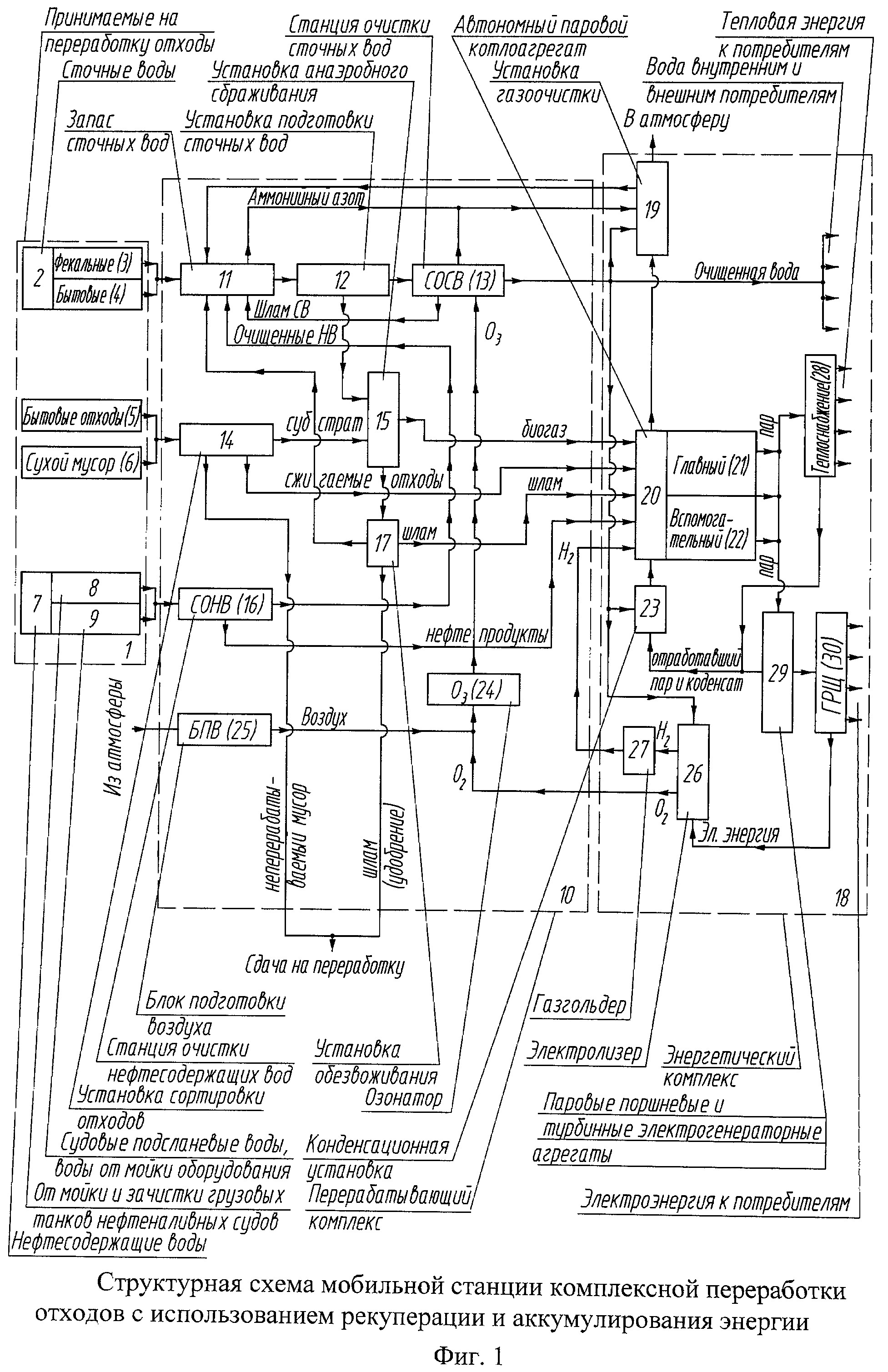 Способ реализуется на станции, состоящей из двух функциональных комплексов - перерабатывающего и энергетического. Первый комплекс служит для предварительной подготовки отходов к обработке с последующей их переработкой. В энергетический комплекс входят тепло- и электрогенерирующие устройства, в которых энергия получается за счет сжигания переработанных отходов в паровых котлоагрегатах. Принципиальная схема станции комплексной переработки отходов с использованием рекуперации и аккумулирования энергии представлена на фигуре 1. Известны устройства стационарных комплексов и станций переработки твердых бытовых отходов и сточных вод, описанные в источниках [1], [2], [3], [5], [9] и мобильных судовых [4], [6], [7], [8]. Наиболее близко по технической сущности является изобретение «Способ комплексной переработки эксплуатационных судовых отходов с использованием рекуперации» патент Российской Федерации RU 2381185. Общими недостатками данных объектов являются следующие: - перерабатывают преимущественно один вид отходов, узко специализированы; - не полон цикл переработки и генерации; - статичность; - высокое энергопотребление; - неудовлетворительные массо-габаритные показатели комплексов; -длительность процесса переработки, обусловленная последовательной переработкой различных видов отходов; - отсутствие структурных элементов для аккумулирования генерируемой энергии и ее выдачи потребителям. Задачей изобретения является повышение эффективности комплексной переработки отходов в тепловую энергию посредством генерации и сжигания биогаза, продуктов очистки нефтесодержащих вод и сухого мусора для использования теплоты их сгорания, а также аккумулирования получаемой энергии. Технический результат изобретения состоится в разработке способа комплексной переработки сточных вод и мусора с целью их последующей рекуперации в тепловую энергию посредством генерации и сжигания биогаза, продуктов очистки нефтесодержащих вод и сухого мусора для использования теплоты их сгорания для нужд энергоснабжения, а также аккумулирования энергии и равномерной ее отдачи потребителям. Число, назначение и работа функциональных единиц станции обеспечивают полное и комплексное решение поставленной задачи. Возможны следующие варианты исполнения данной станции: самоходное или несамоходное судно, стационарная станция блок-контейнерного исполнения, мобильная станция на автотранспортных платформах. Подобная станция может быть использована для комплексной переработки и очистки загрязняющих сточных вод и мусора, а также генерации тепло- и электроэнергии для отдельных предприятий, организаций, муниципальных образований, военных городков, удаленных баз отдыха, малых населенных пунктов сельских районов, малонаселенных северных территорий, в качестве дублирующих и вспомогательных, а также на время строительства мусороперерабатывающих заводов. Предлагаемое изобретение позволит обеспечить полную комплексную переработку отходов и их рекуперацию посредством генерации и сжигания биогаза, продуктов очистки нефтесодержащих вод и сухого мусора с последующем использованием полученной при сгорании теплоты в целях равномерного снабжения как тепловой, электрической, так и механической энергиями, а также улучшит экологическую и энергетическую обста