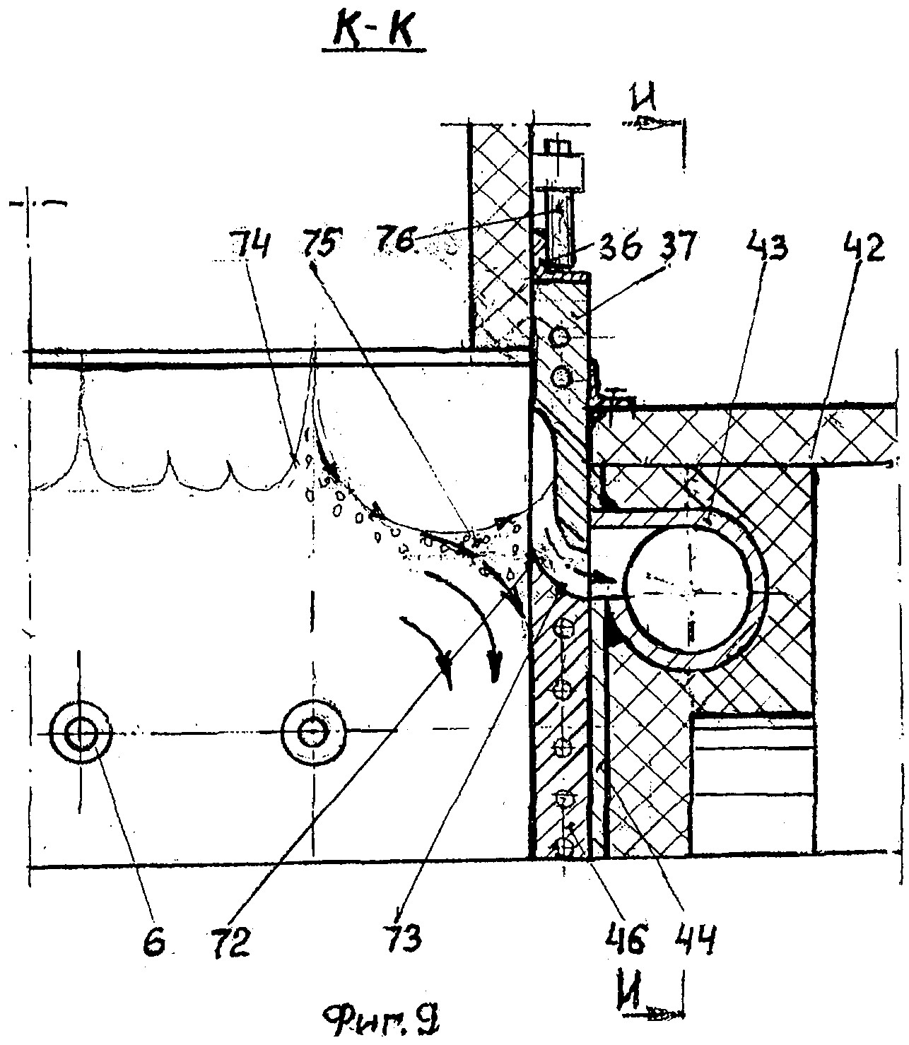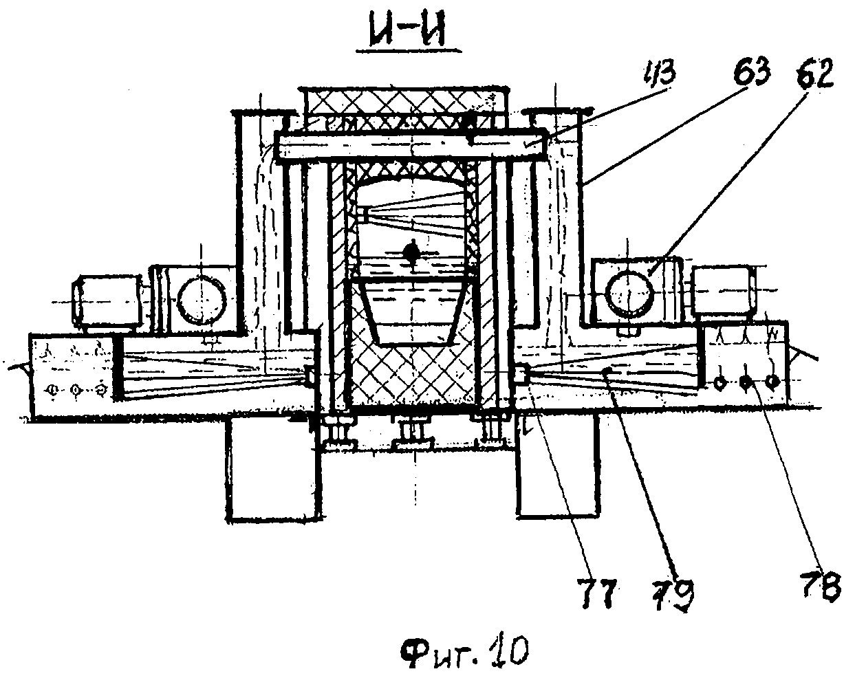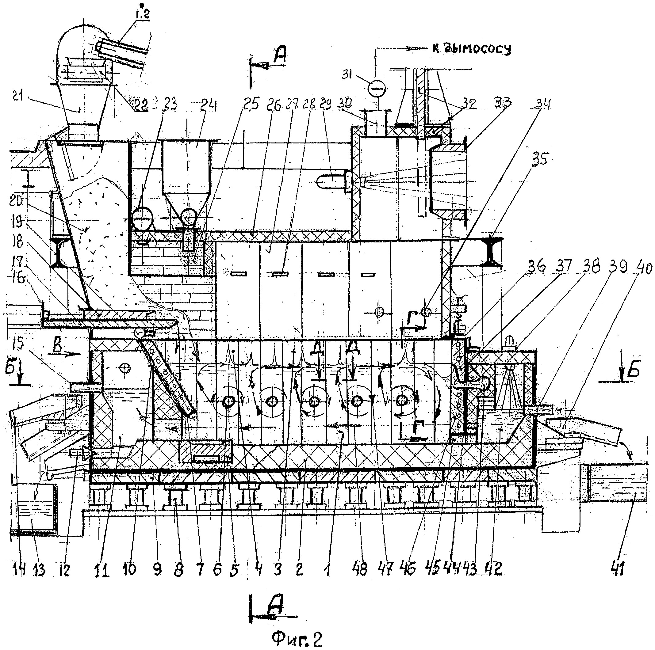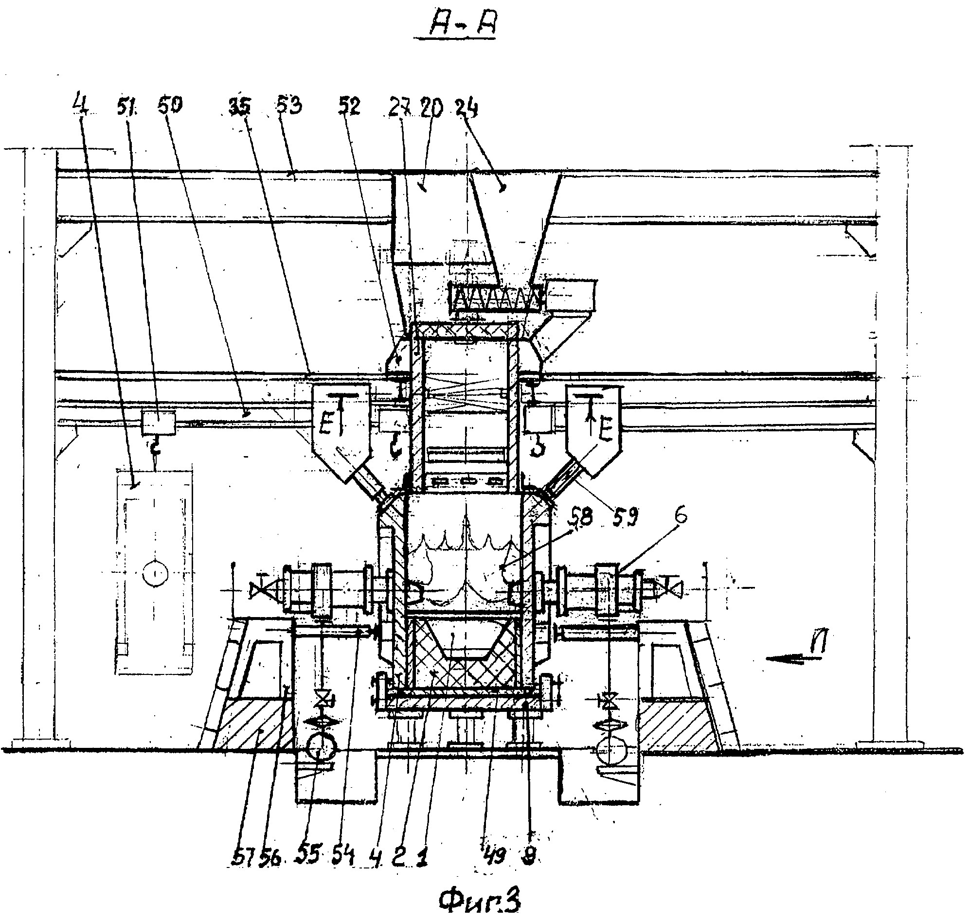 Главным агрегатом технологической линии МСЗнп является многозонная печь с пылеосадительной камерой представленной на фиг.2, где показан продольный разрез по оси симметрии печи. На фиг.3 показан поперечный разрез А-А на фиг.2 печи, где дано расположение печи в технологическом пролете комплекса МСЗнп. На фиг.4 показан вид по стрелке «Л» на фиг.3, где показана барьерная гряда с опорными балками, в виде гребенки, которая предназначена для размещения упорных винтов и проводки боковых кессонов ванны через барьерную гряду. На фиг.5 показан разрез Б-Б на фиг.2, где дан вид сверху на кессонированную ванну печи с копильниками, а также показаны устройства для удаления шлаковой пены и расположение поворотных желобов с ямами грануляции продуктов плавки. На фиг.6 - вид по стрелке В на фиг.2, где показано расположение сливных устройств на переднем торце печи. На фиг.7 - сечение Д-Д на фиг.2, где показаны уплотнительные устройства герметизации стыков кессонов и перегородок. На фиг.8 - сечение Г-Г на фиг.2, где показаны уплотнение между кессонированной шахтой и обечайкой шатра, а также часть центрального окна с шиберным затвором-волноломом. На фиг.9 - сечение К-К на фиг.5, где показаны: - стрелками движение шлаковой пены, содержащей коллоиды; - расположение пристенной лунки, где концентрируются коллоидные растворы и разрушаются газовые пузыри о шиберную задвижку; - устройство для вывода шлаковой пены в щелевой коллектор. На фиг.10 - разрез по И-И на фиг.9, где показано устройство для дегазации и грануляции шлака, обогащенного коллоидами и флотации мутьевого потока для отделения пустой породы от тяжелых фракций. На фиг.11 - сечение Е-Е на фиг.3, где показана схема газовых потоков обтекателя, над барботируемой ванной в печи. Многозонная печь с пылеосадительной камерой, представленная на фиг.2, содержит: ванну 1; подину 2, футерованную огнеупорами; нижний прямоточный кессон 3 - шахты; нижний фурменный кессон 4 - шахты; кессонированная часть подины 5; циклонная топка 6 - с соплом; передняя наклонная перегородка 7 - водоохлаждаемая; колонны фундамента 8; подовые кессоны 9; стенка переднего отсека 10; передний копильник 11 - для шлака; аварийная летка 12; аварийная ванна 13 - для грануляции шлака; поворотный желоб 14; окно 15 - для непрерывного слива шлака; гидроцилиндр 16 - для возвратно-поступательного перемещения толкателя; стол 17 - днище бункера; толкатель 18; щелевые горелки 19 - отдувки шихты; щелевой бункер 20 - для ТБО; воронка с затвором 21; поперечный ленточный транспортер 22, расположенный на колошниковой площадке печи; коллектор подогретого воздуха 23 - для печи и топок; бункер 24 - со шнековым приводом для подачи подшихтовки печи чугунной стружкой и вторичными отходами; соединительная камера 25 - футерованная огнеупорами; свод шатра 26; боковой кессон шатра 27; щелевая горелка обтекателя 28; форсунка 29 - подачи карбамида с паром; обводной газоход 30 - печи; поворотная заслонка 31; пылеосадительная камера 32 - с шиберным затвором; горловина 33 - основного газохода печи; трубка 34 - подачи воздуха для дожигания CO; ферма моста 35 - для подвески обечайки шатра в технологическом пролете печи; уплотнительный уголок 36 - с набивкой из огнеупорной массы; шиберный затвор 37 - волнолом, который регулирует проходное сечение центрального окна - для отсоса шлаковой пены, обогащенный коллоидами; горелка 38 обогрева ко