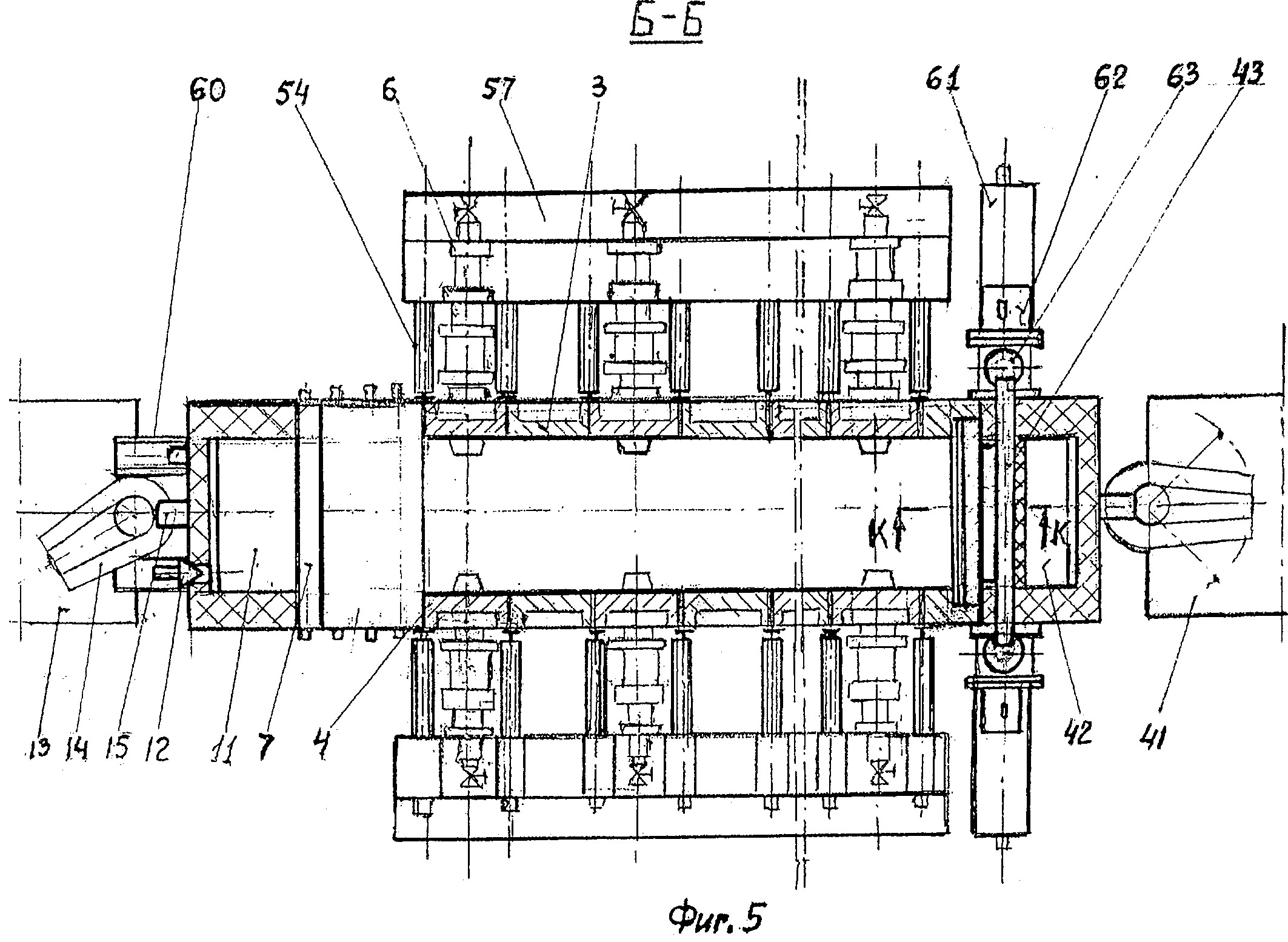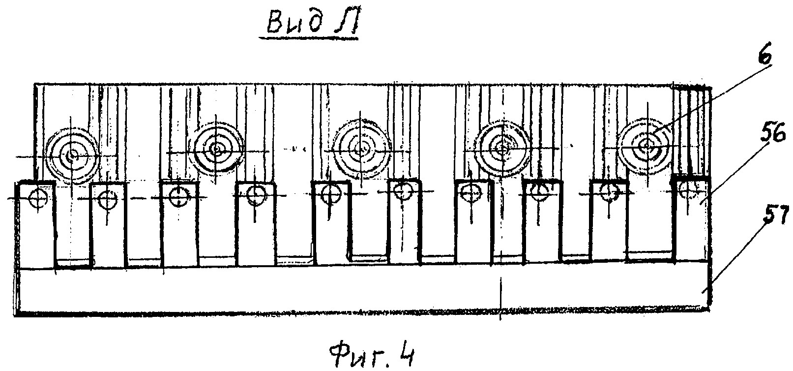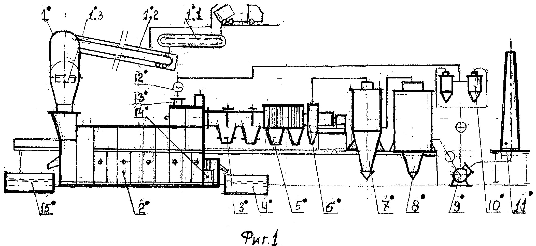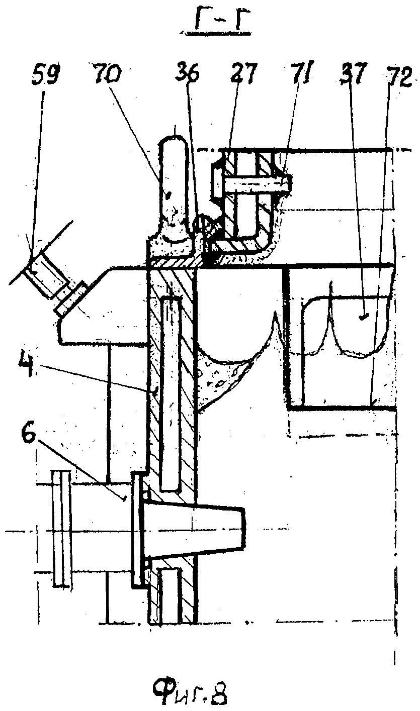 Главным агрегатом технологической линии МСЗнп является многозонная печь с пылеосадительной камерой представленной на фиг.2, где показан продольный разрез по оси симметрии печи. На фиг.3 показан поперечный разрез А-А на фиг.2 печи, где дано расположение печи в технологическом пролете комплекса МСЗнп. На фиг.4 показан вид по стрелке «Л» на фиг.3, где показана барьерная гряда с опорными балками, в виде гребенки, которая предназначена для размещения упорных винтов и проводки боковых кессонов ванны через барьерную гряду. На фиг.5 показан разрез Б-Б на фиг.2, где дан вид сверху на кессонированную ванну печи с копильниками, а также показаны устройства для удаления шлаковой пены и расположение поворотных желобов с ямами грануляции продуктов плавки. На фиг.6 - вид по стрелке В на фиг.2, где показано расположение сливных устройств на переднем торце печи. На фиг.7 - сечение Д-Д на фиг.2, где показаны уплотнительные устройства герметизации стыков кессонов и перегородок. На фиг.8 - сечение Г-Г на фиг.2, где показаны уплотнение между кессонированной шахтой и обечайкой шатра, а также часть центрального окна с шиберным затвором-волноломом. На фиг.9 - сечение К-К на фиг.5, где показаны: - стрелками движение шлаковой пены, содержащей коллоиды; - расположение пристенной лунки, где концентрируются коллоидные растворы и разрушаются газовые пузыри о шиберную задвижку; - устройство для вывода шлаковой пены в щелевой коллектор. На фиг.10 - разрез по И-И на фиг.9, где показано устройство для дегазации и грануляции шлака, обогащенного коллоидами и флотации мутьевого потока для отделения пустой породы от тяжелых фракций. На фиг.11 - сечение Е-Е на фиг.3, где показана схема газовых потоков обтекателя, над барботируемой ванной в печи. Многозонная печь с пылеосадительной камерой, представленная на фиг.2, содержит: ванну 1; подину 2, футерованную огнеупорами; нижний прямоточный кессон 3 - шахты; нижний фурменный кессон 4 - шахты; кессонированная часть подины 5; циклонная топка 6 - с соплом; передняя наклонная перегородка 7 - водоохлаждаемая; колонны фундамента 8; подовые кессоны 9; стенка переднего отсека 10; передний копильник 11 - для шлака; аварийная летка 12; аварийная ванна 13 - для грануляции шлака; поворотный желоб 14; окно 15 - для непрерывного слива шлака; гидроцилиндр 16 - для возвратно-поступательного перемещения толкателя; стол 17 - днище бункера; толкатель 18; щелевые горелки 19 - отдувки шихты; щелевой бункер 20 - для ТБО; воронка с затвором 21; поперечный ленточный транспортер 22, расположенный на колошниковой площадке печи; коллектор подогретого воздуха 23 - для печи и топок; бункер 24 - со шнековым приводом для подачи подшихтовки печи чугунной стружкой и вторичными отходами; соединительная камера 25 - футерованная огнеупорами; свод шатра 26; боковой кессон шатра 27; щелевая горелка обтекателя 28; форсунка 29 - подачи карбамида с паром; обводной газоход 30 - печи; поворотная заслонка 31; пылеосадительная камера 32 - с шиберным затвором; горловина 33 - основного газохода печи; трубка 34 - подачи воздуха для дожигания CO; ферма моста 35 - для подвески обечайки шатра в технологическом пролете печи; уплотнительный уголок 36 - с набивкой из огнеупорной массы; шиберный затвор 37 - волнолом, который регулирует проходное сечение центрального окна - для отсоса шлаковой пены, обогащенный коллоидами; горелка 38 обогрева ко